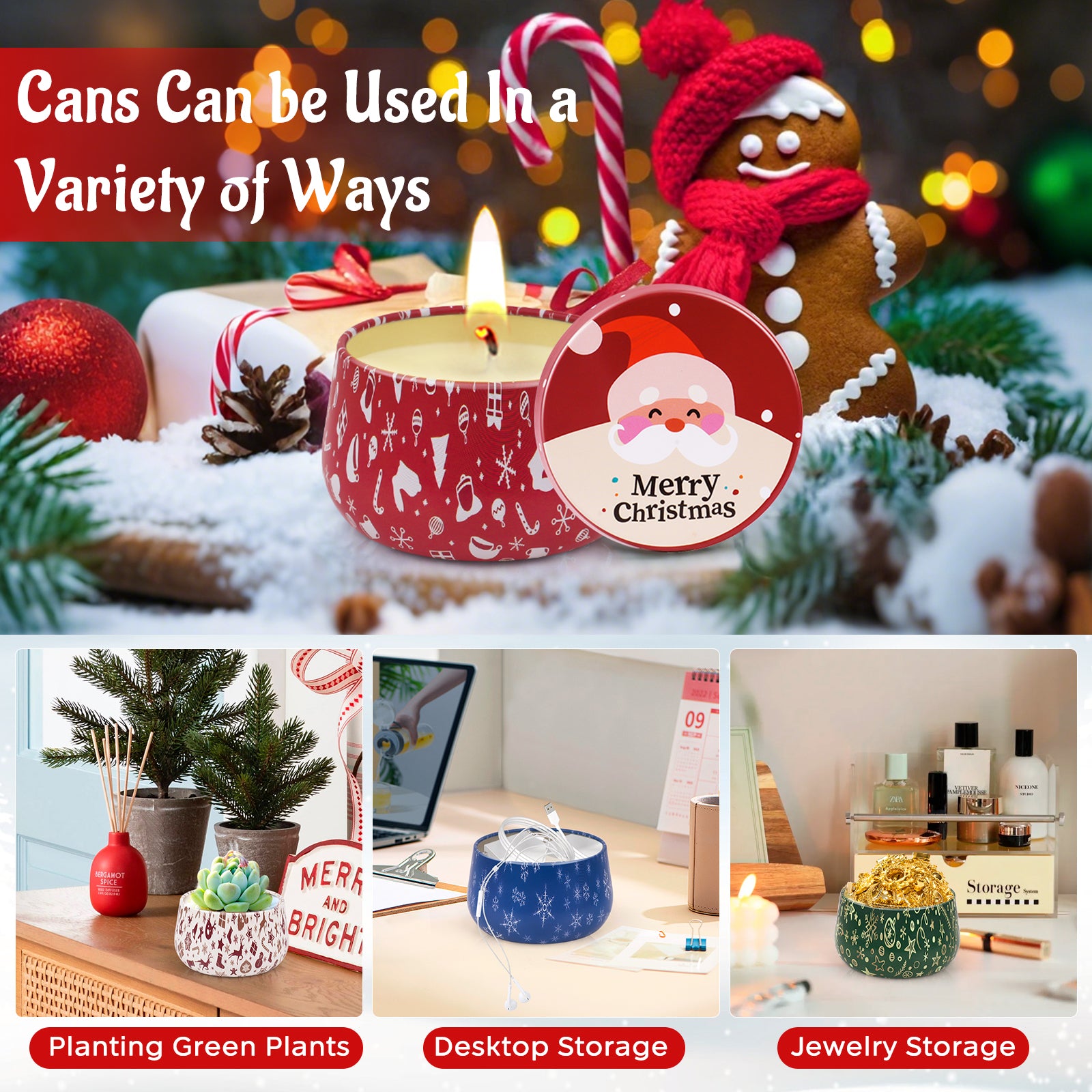 - Elegant & Reusable 2.5 oz Tin Jars: Each candle comes in a charming, portable tin jar adorned with festive holiday designs. The perfect size for any room—a desk, bathroom, or bedside table. Once the candle is finished, the sturdy tin can be repurposed for storing trinkets, cotton balls, or other small treasures.