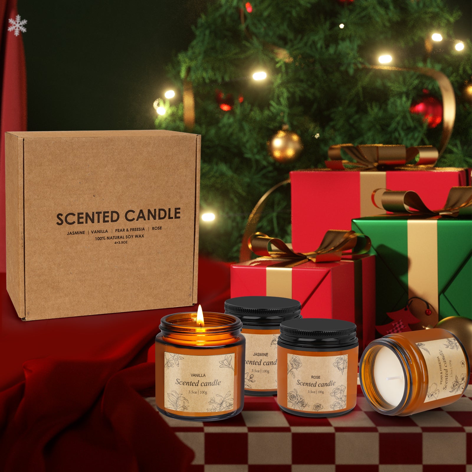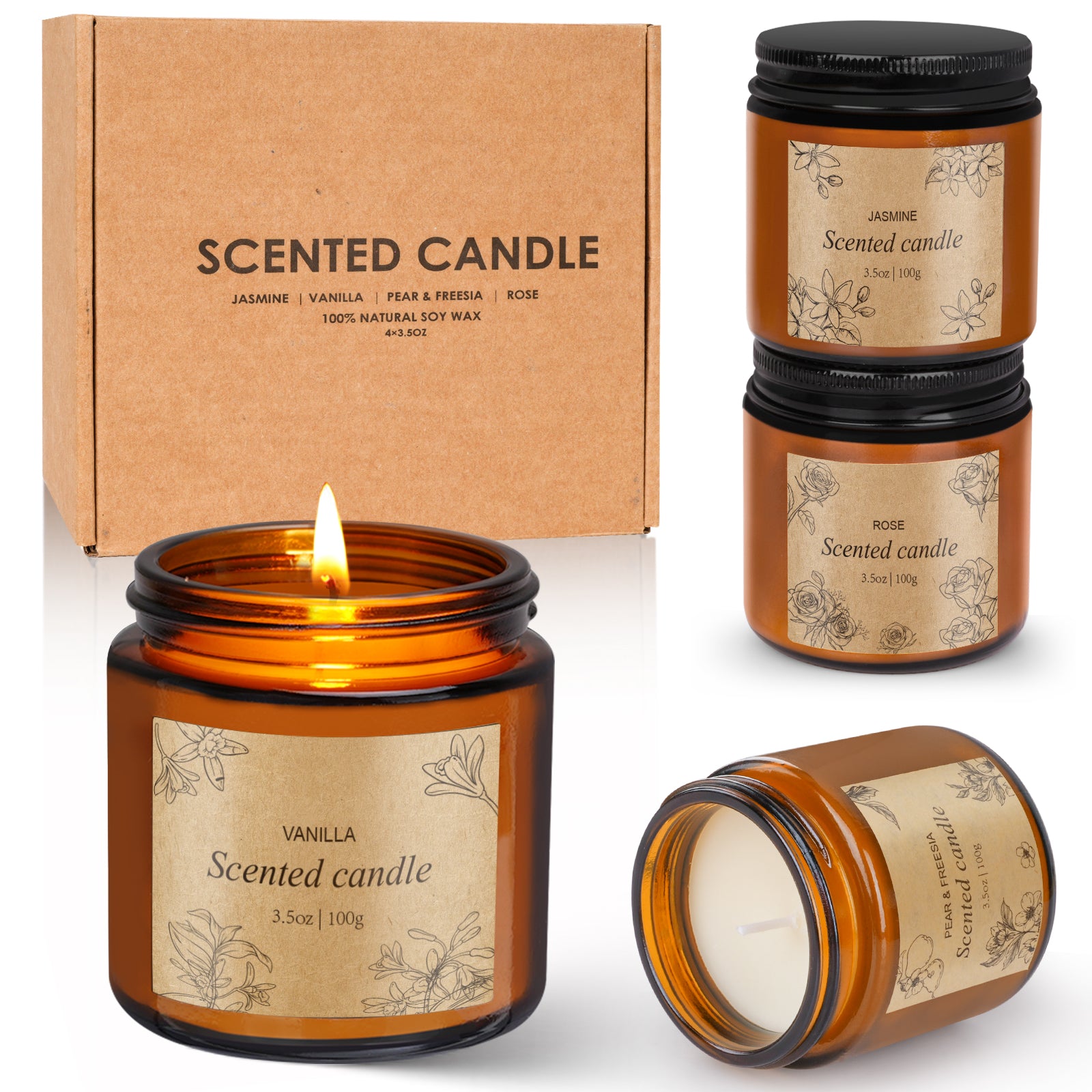Aromatherapy Candle Set: We have carefully blended 4 different fragrance types, rose, vanilla, jasmine and pear & freesia, Whether you like the natural atmosphere or the personalized flavour, this candle pack can meet your needs. Each candles is a unique fragrance combination that brings you a comprehensive enjoyment of body and mind. Soy Wax Candles: Scented candle is made with natural soy wax, free of harmful ingredients, with cotton wick to minimize ash and clumping. Meanwhile, our aromatherapy candles burn for approximately 120 hours, allowing you to enjoy a more long lasting aroma and comfortable experience.